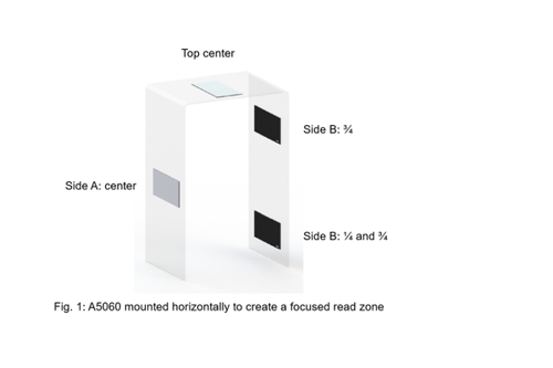 The design of the A5060 guarantees superior performance across a wide range of portal applications, making it the ultimate choice. Its elliptical beam shape allows users to create a highly confined read zone within the portal avoiding stray reads outside the portal. To create a high performing read zone, mount the A5060 horizontally as shown in Fig. 1 (above).